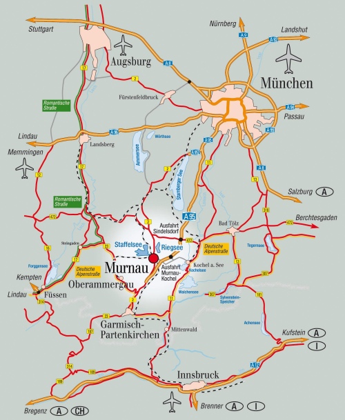- Autobahn (motorway) A 95 Munich - Garmisch-Partenkirchen, exit Sindelsdorf or Murnau