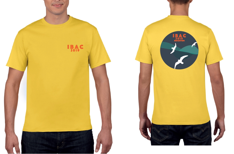All logos will be printed on the back of the t-shirt with “IBAC 2019” in red lettering on the front, as in this example: